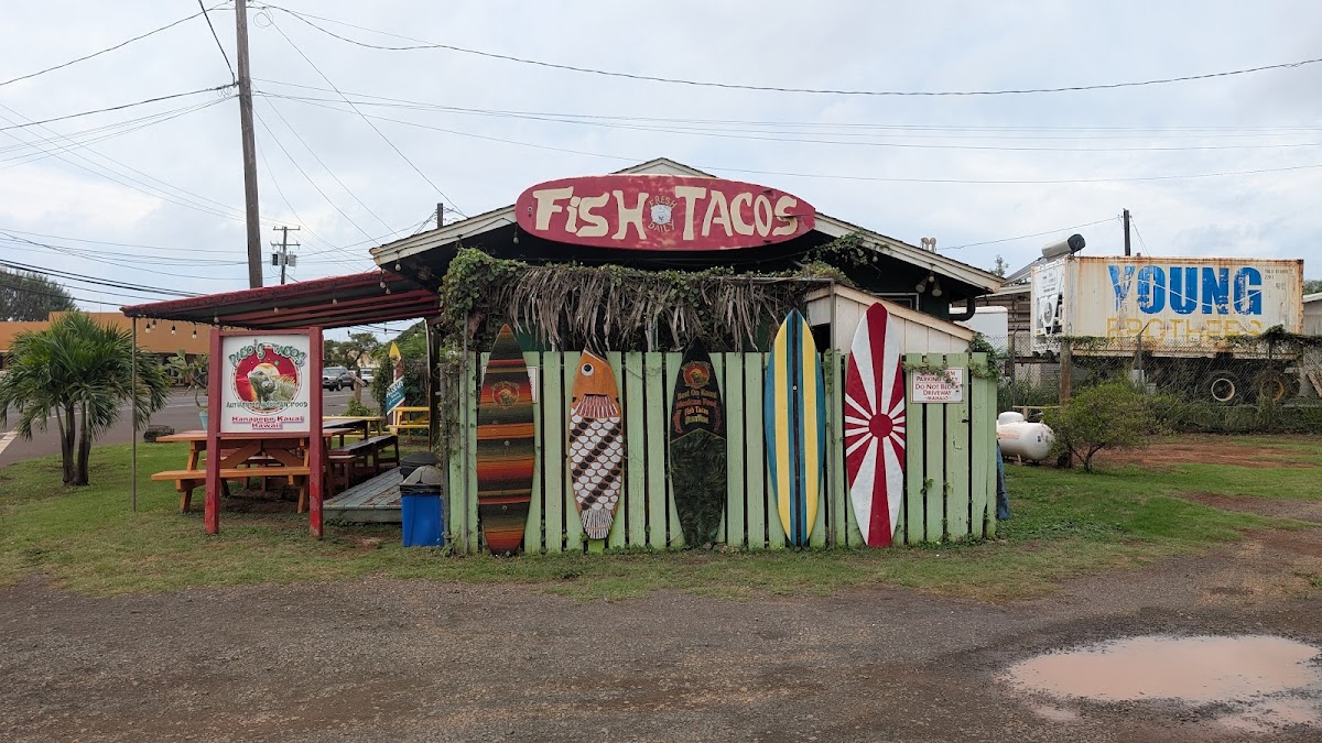 A cute little taco stand advertising “authentic Mexican food” located just off the main highway in Hanapepe (although I think there are other locations elsewhere on the island). On a Monday at 11:45 we were the only customers and each ordered two tacos, fish and carnitas. You order at the window and they call you when the food is ready. There are a handful of picnic tables scattered around the taco shack or get the food to go. The fish taco was good, but the pork with big chunks of tender pork was fantastic-highly recommended. They were pretty quick and reasonably priced with tacos around $7 each.