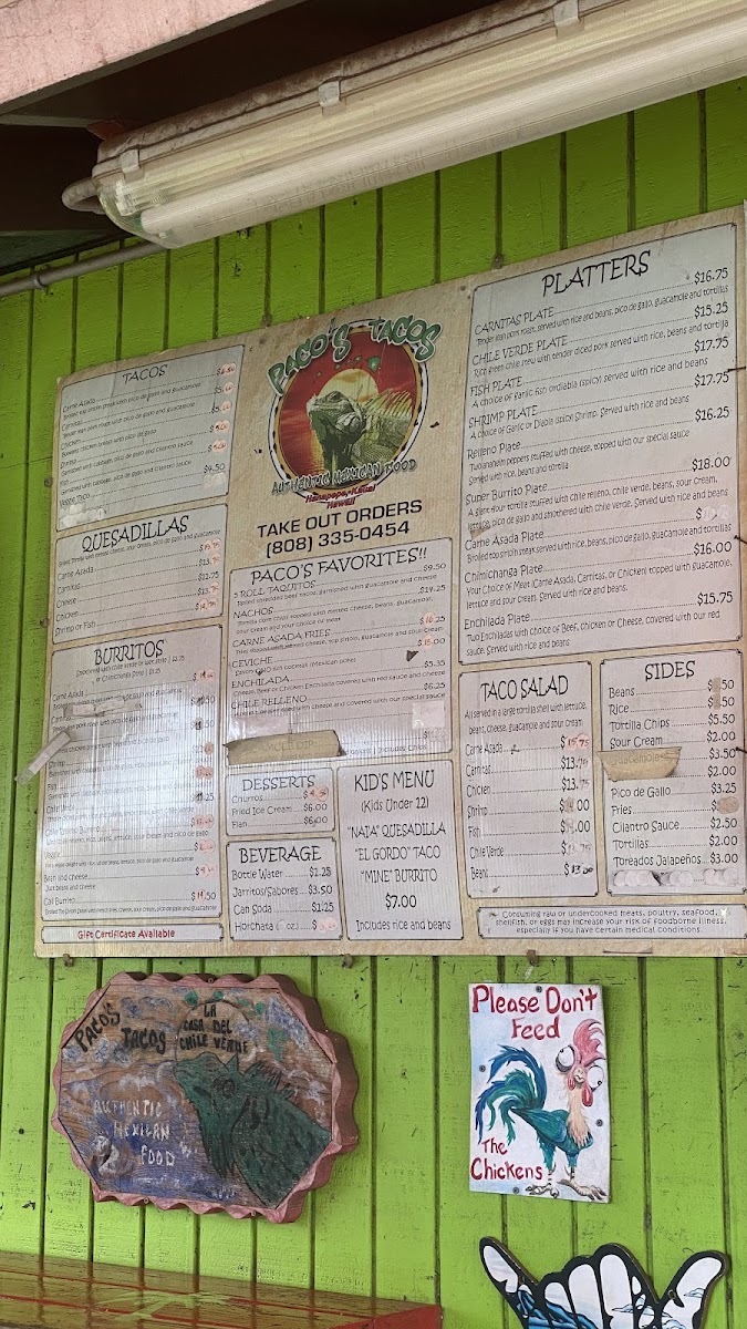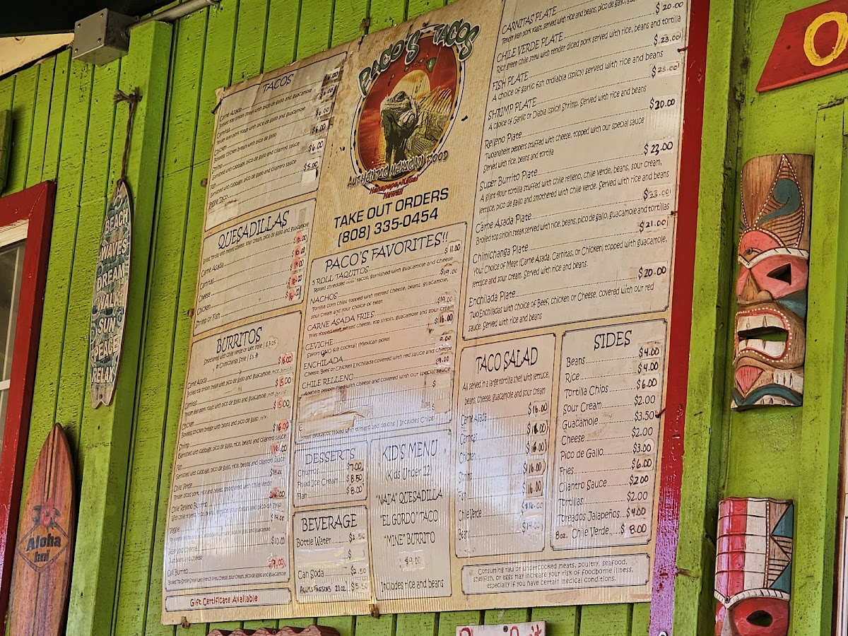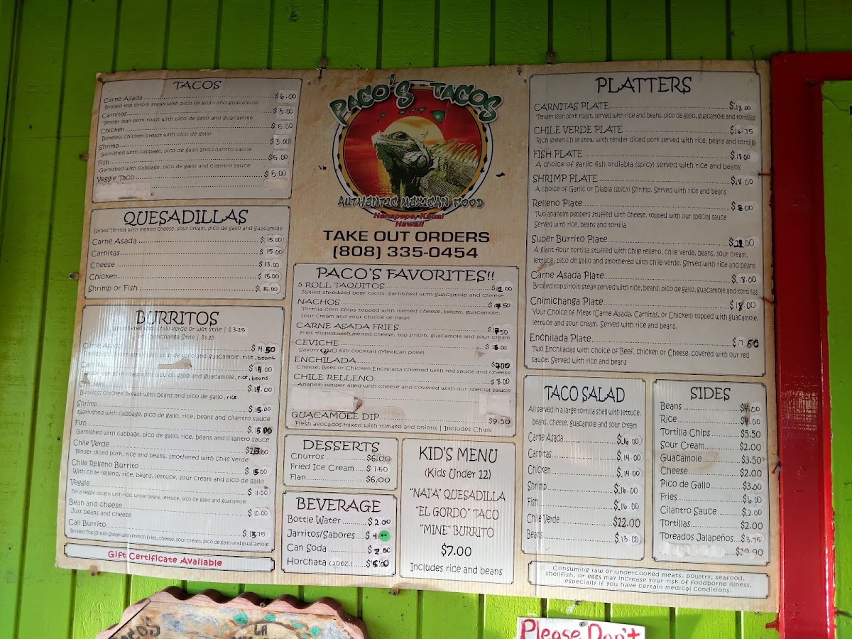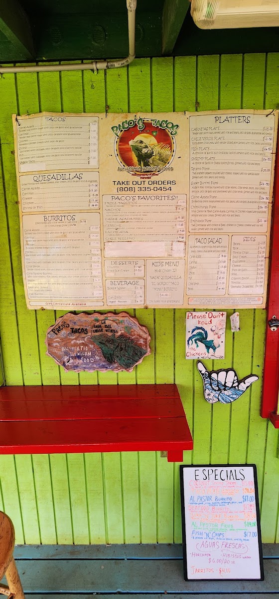 Paco's Tacos serves up a straightforward and inviting menu centered on authentic Mexican flavors with a laid-back island vibe. The offerings focus on casual bites perfect for a relaxed meal throughout the day, from a quick lunch after a hike to a laid-back dinner shared with friends or family.