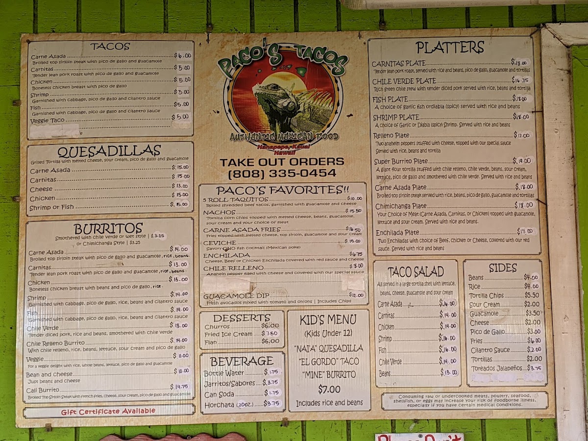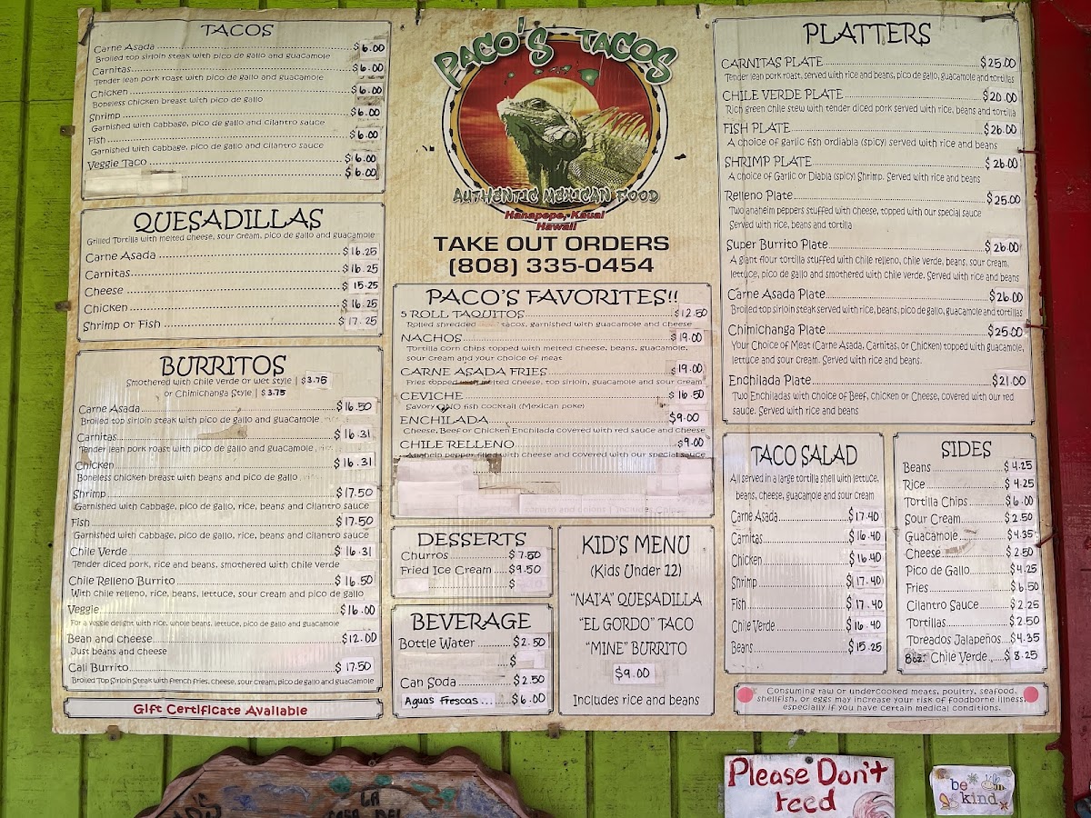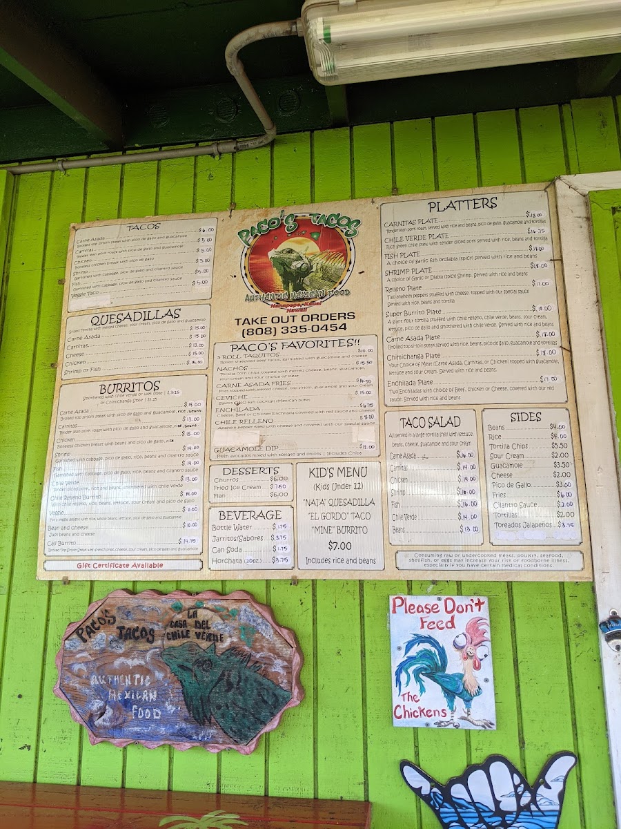 Paco's Tacos serves up a straightforward and inviting menu centered on authentic Mexican flavors with a laid-back island vibe. The offerings focus on casual bites perfect for a relaxed meal throughout the day, from a quick lunch after a hike to a laid-back dinner shared with friends or family.